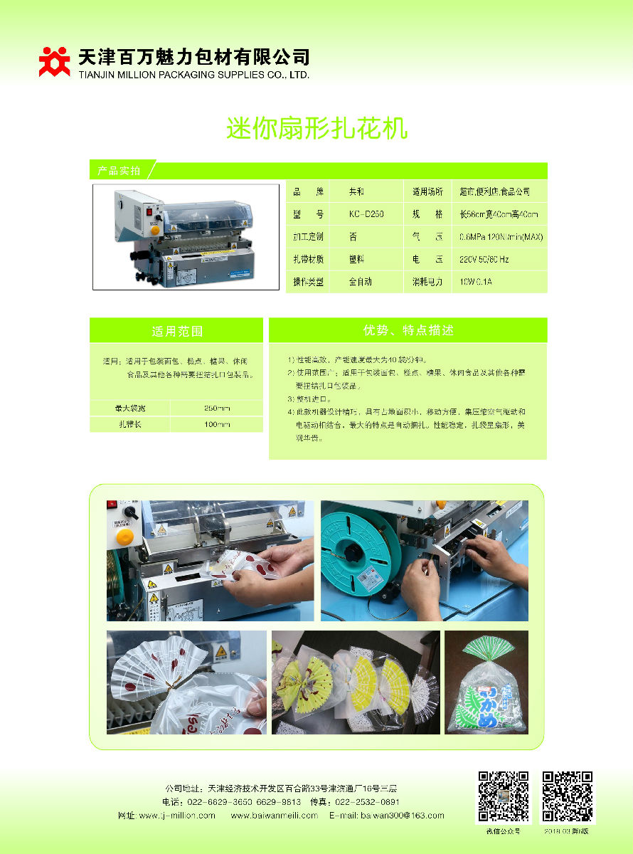 4)此款机器设计精巧,具有占地面积小,移动方便,集压缩空气和电驱动相结合,最大特点是自动捆扎,性能稳定,扎袋呈扇形,美观华贵!